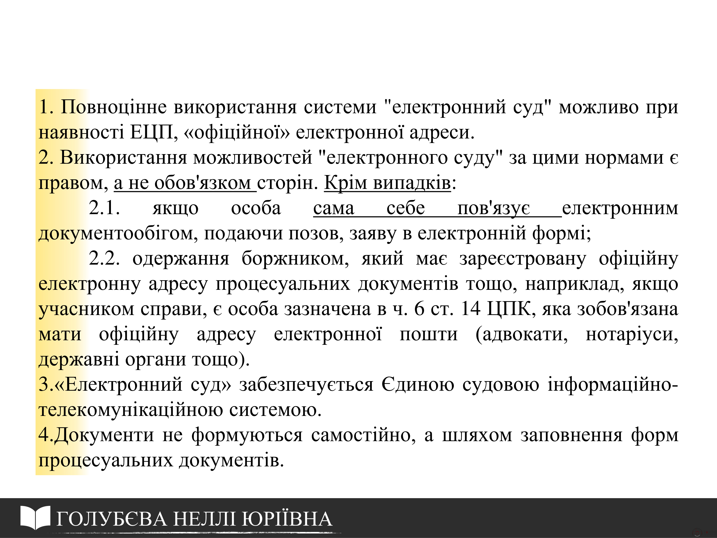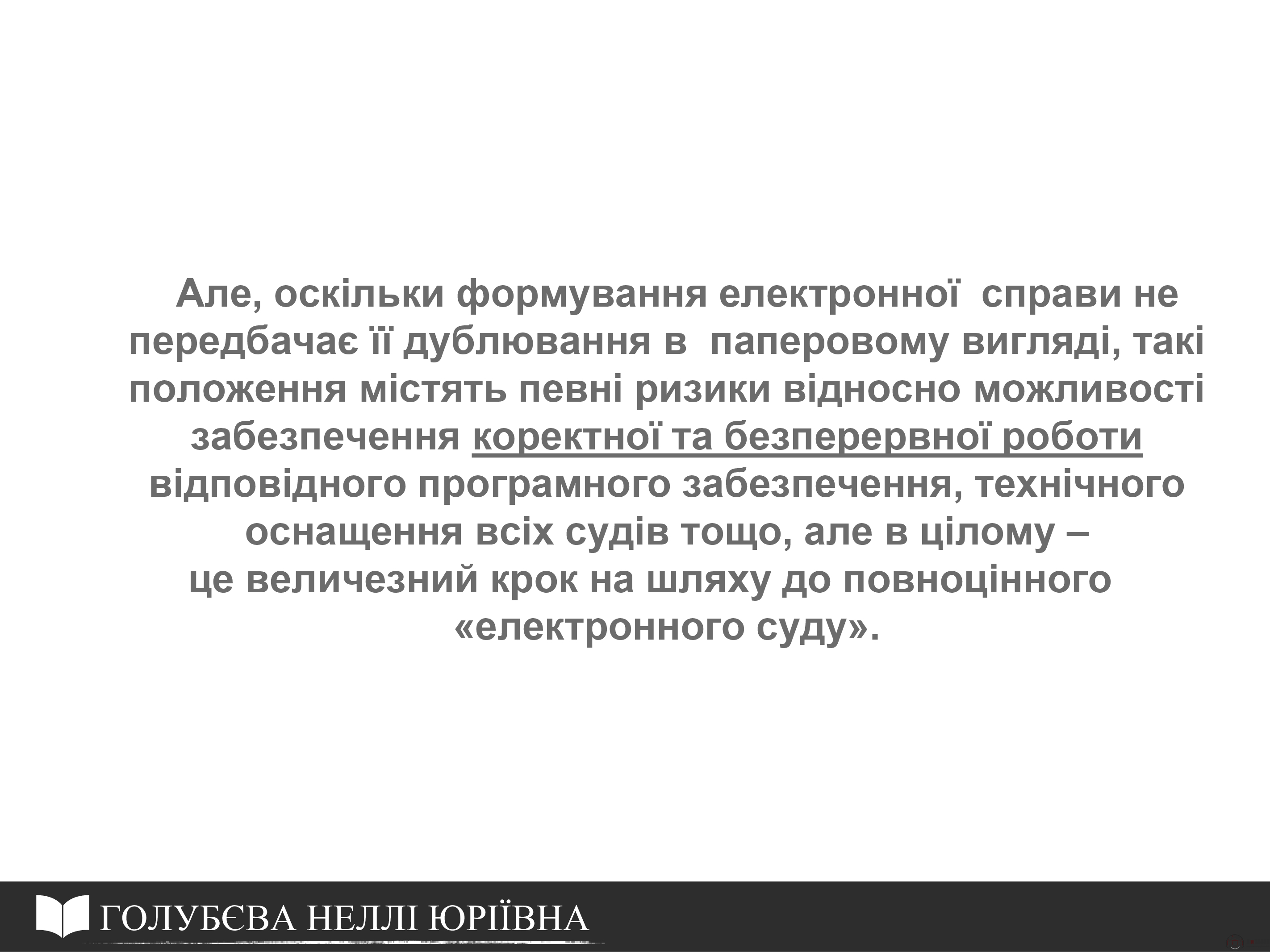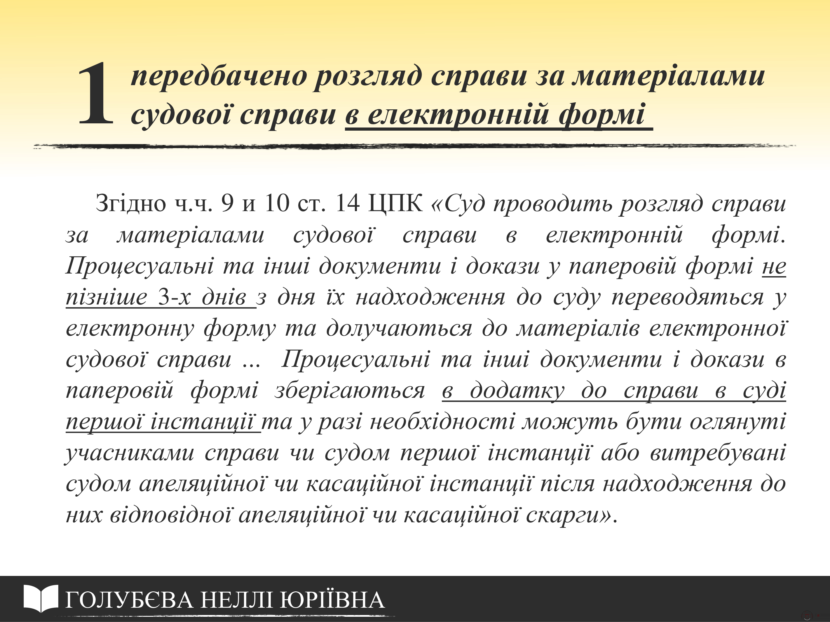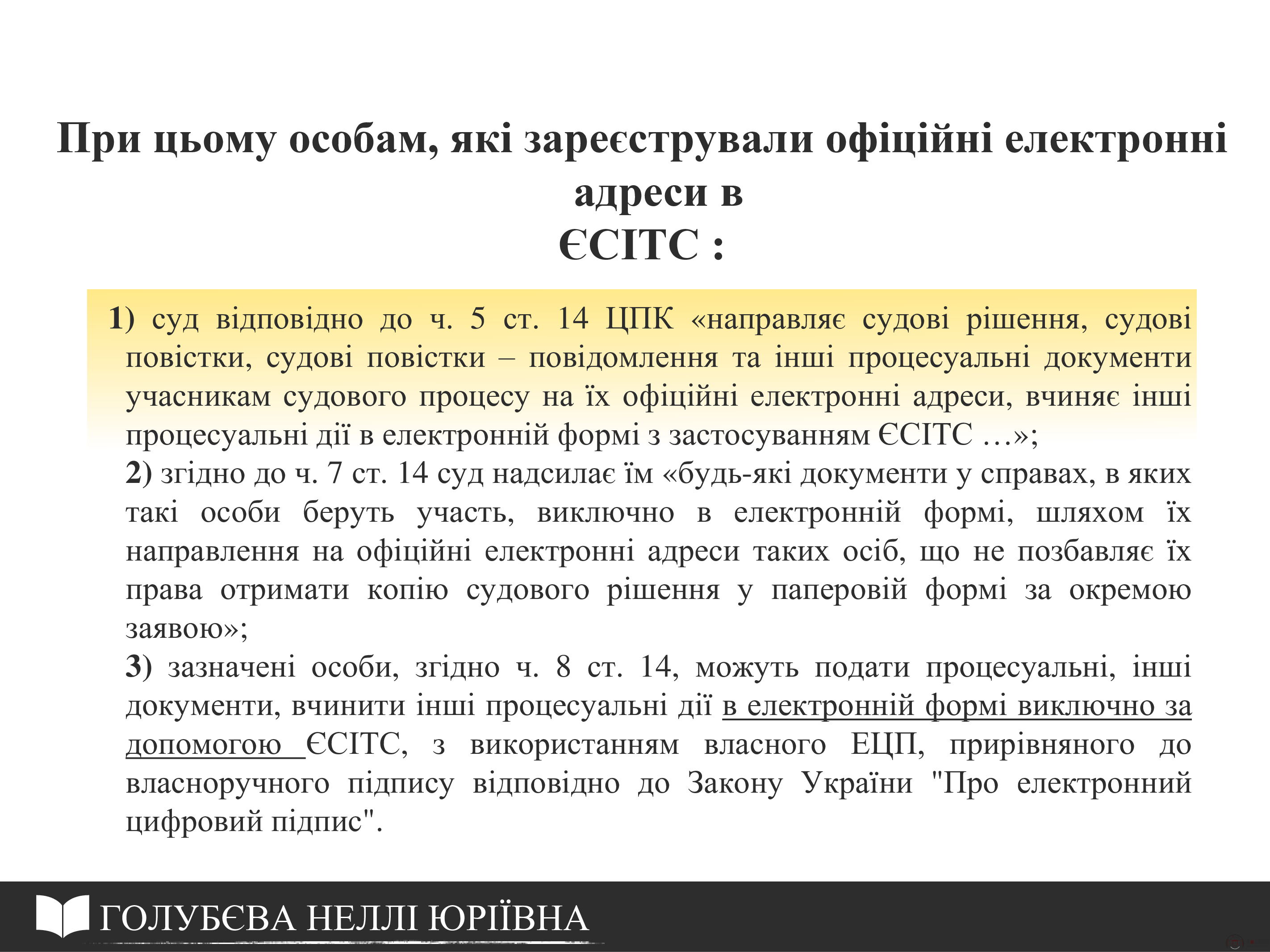 Во время докладов я пыталась комментировать ГПК (как и ХПК в этой части) опираясь на опыт других стран, разных моделей электронного судопроизводства (по крайней мере выделяю три таких принципиально разных модели) и текст процессуальных кодексов. В презентации есть только «сухое» изложение действующих процессуальных норм с беглым анализом, которое, конечно, нуждается в отдельных объяснениях.