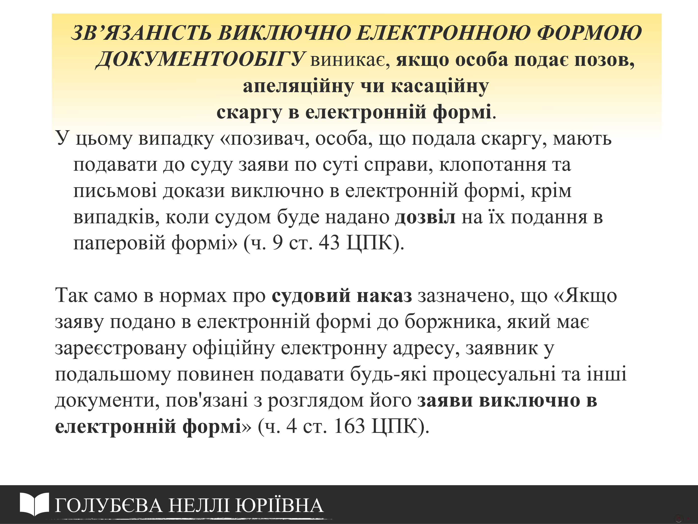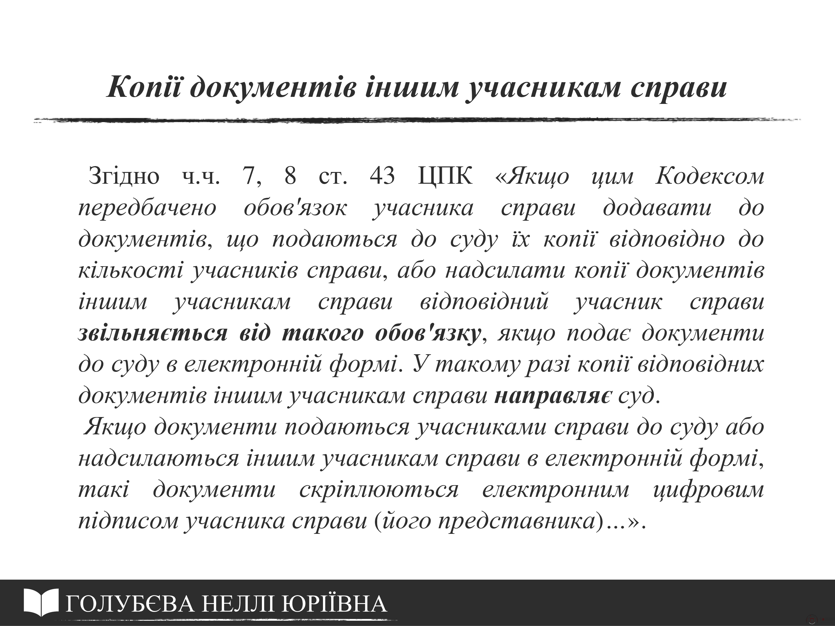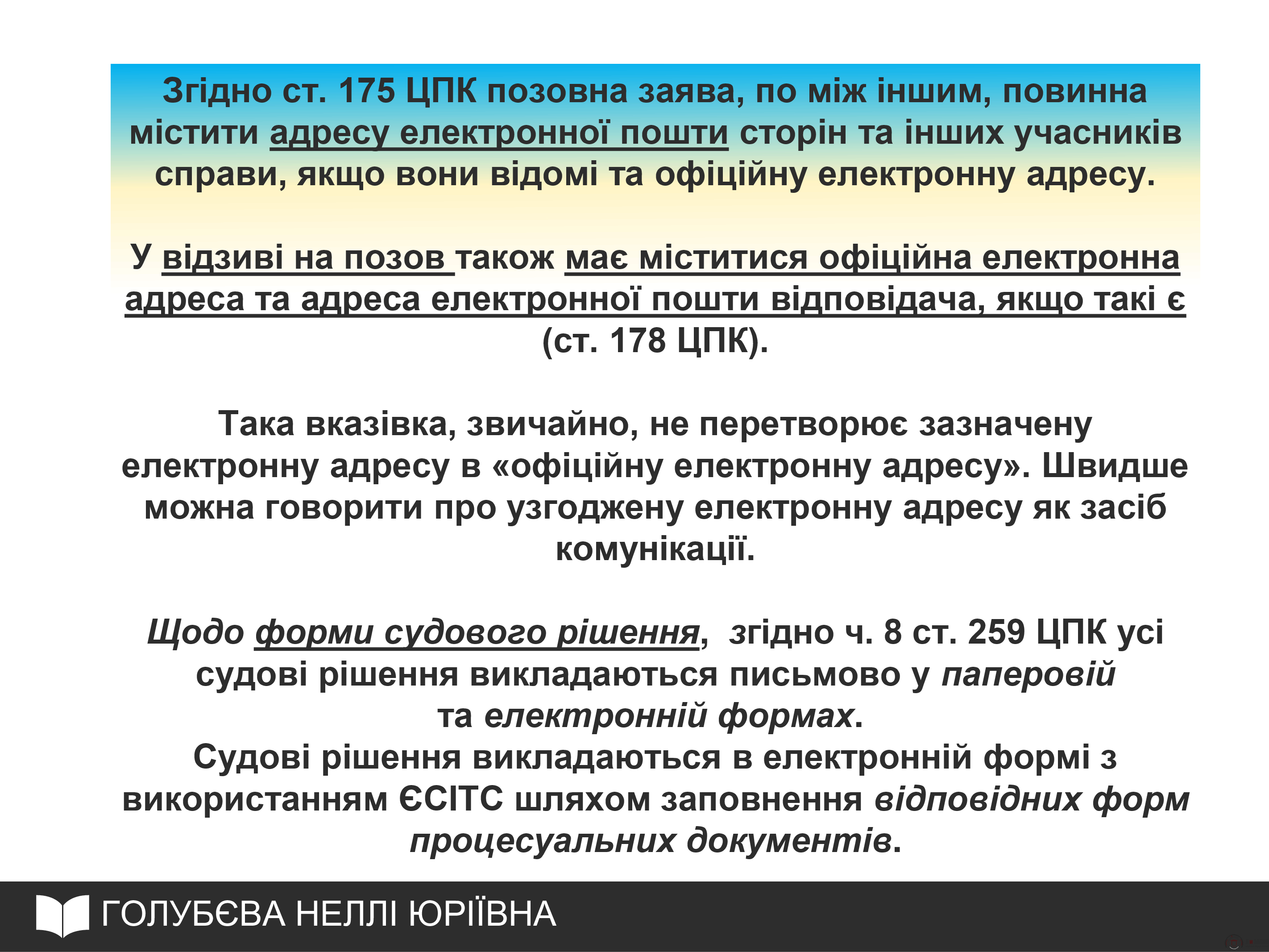 Во время докладов я пыталась комментировать ГПК (как и ХПК в этой части) опираясь на опыт других стран, разных моделей электронного судопроизводства (по крайней мере выделяю три таких принципиально разных модели) и текст процессуальных кодексов. В презентации есть только «сухое» изложение действующих процессуальных норм с беглым анализом, которое, конечно, нуждается в отдельных объяснениях.