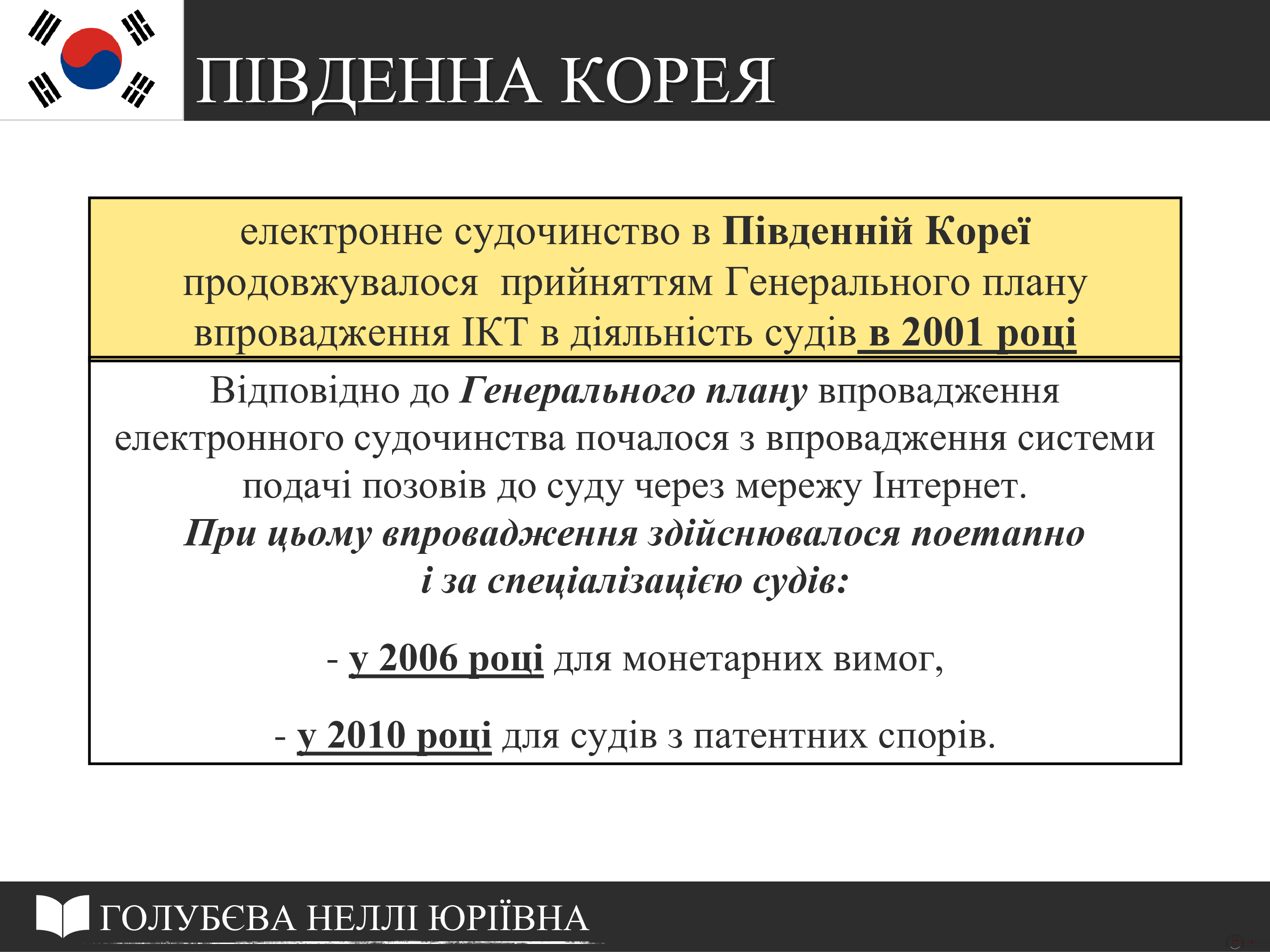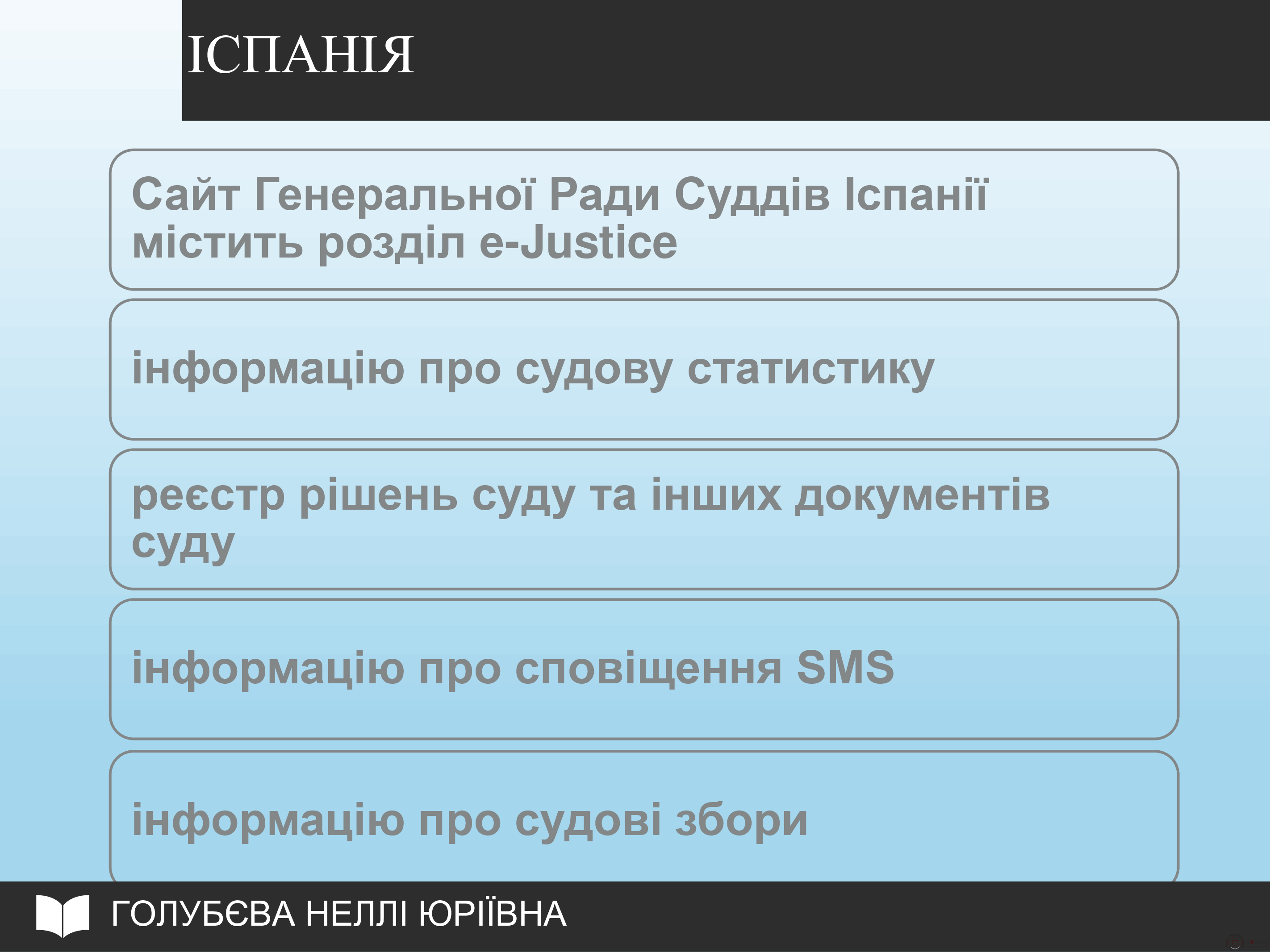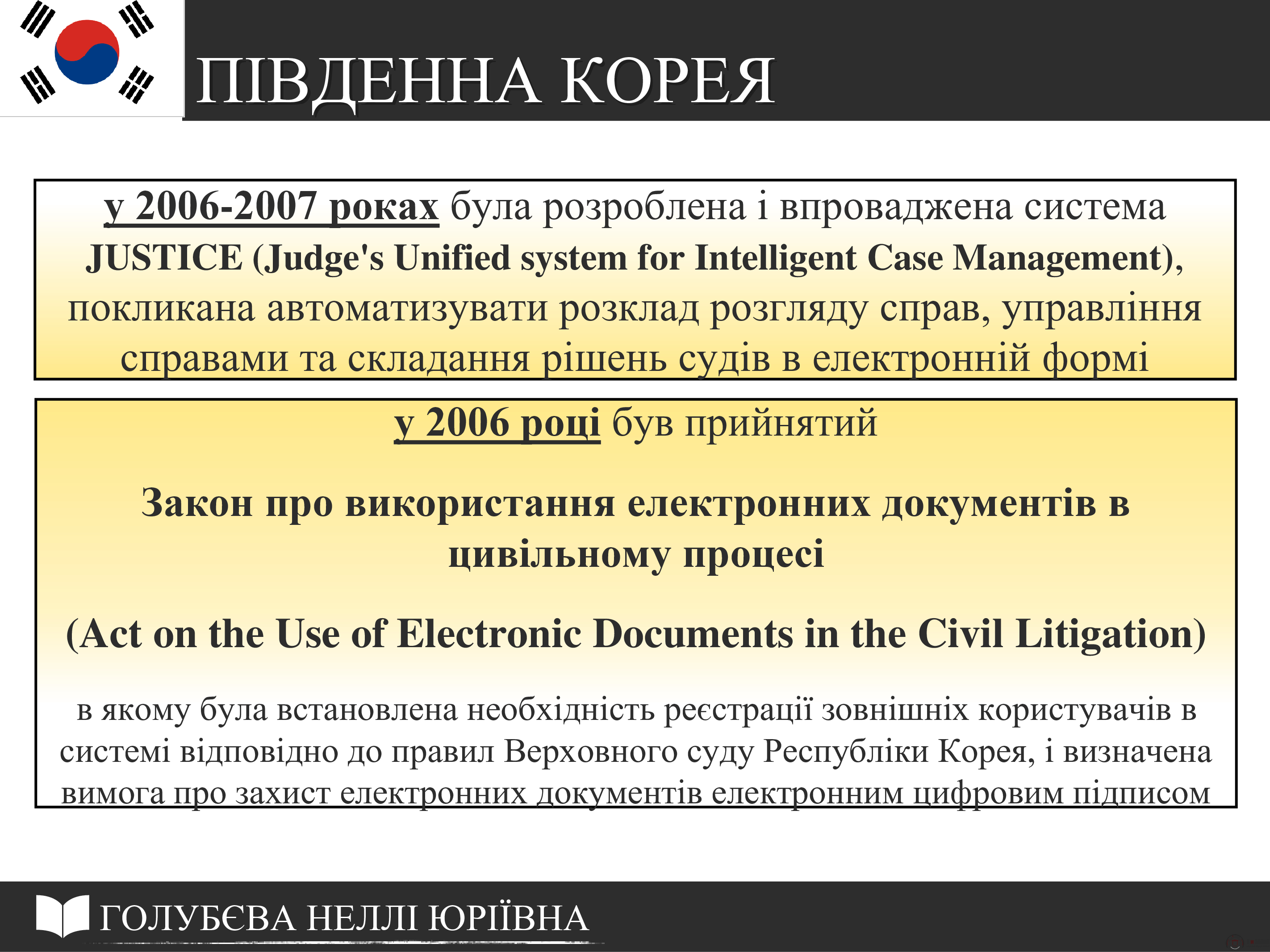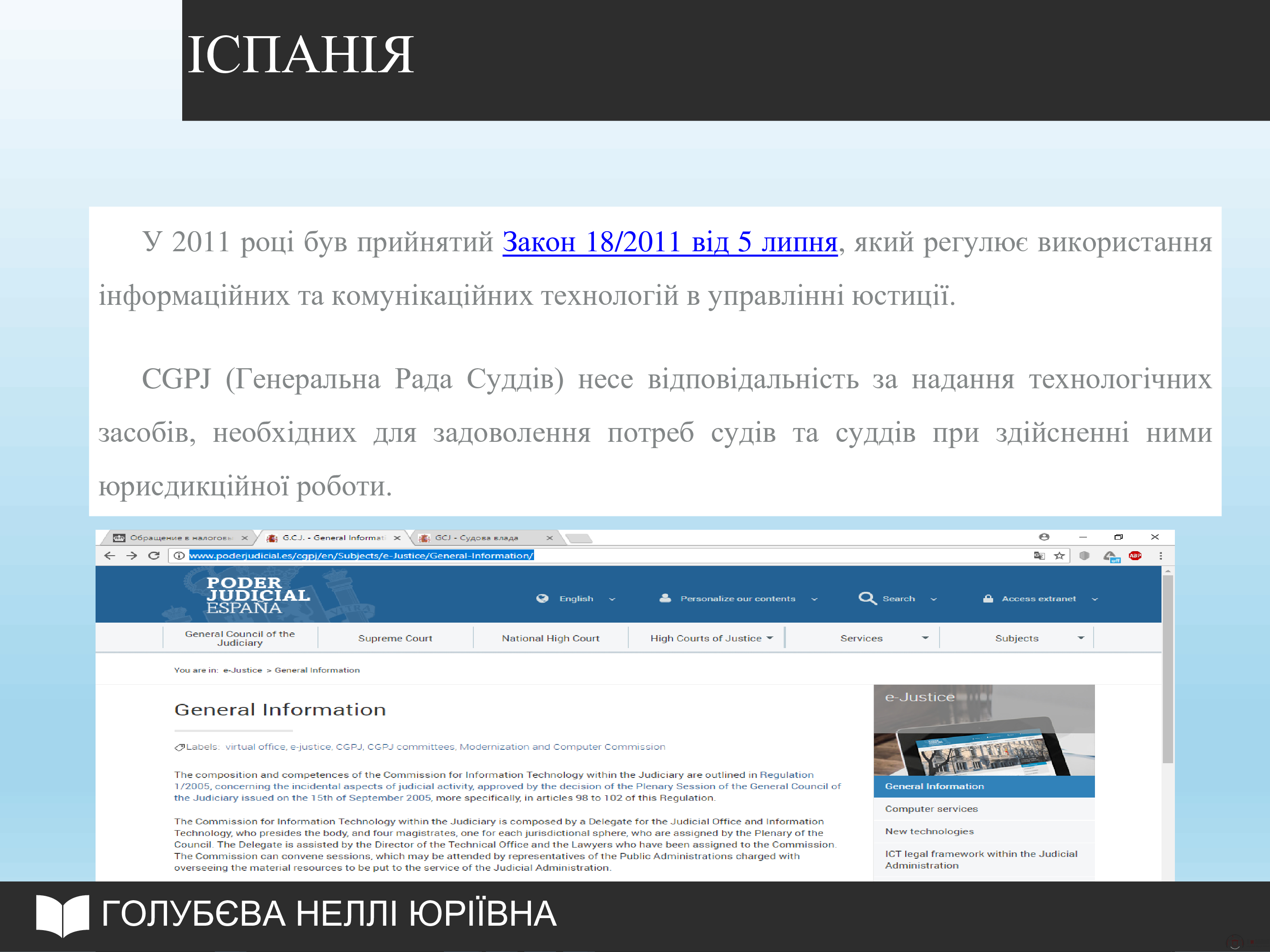 14. Голубєва Н.Ю. Впровадження інформаційно-телекомунікаційних технологій в судову діяльність Німеччини та Франції // Вісник асоціації слідчих суддів України. – 2018. — №1. – С. 37-41.