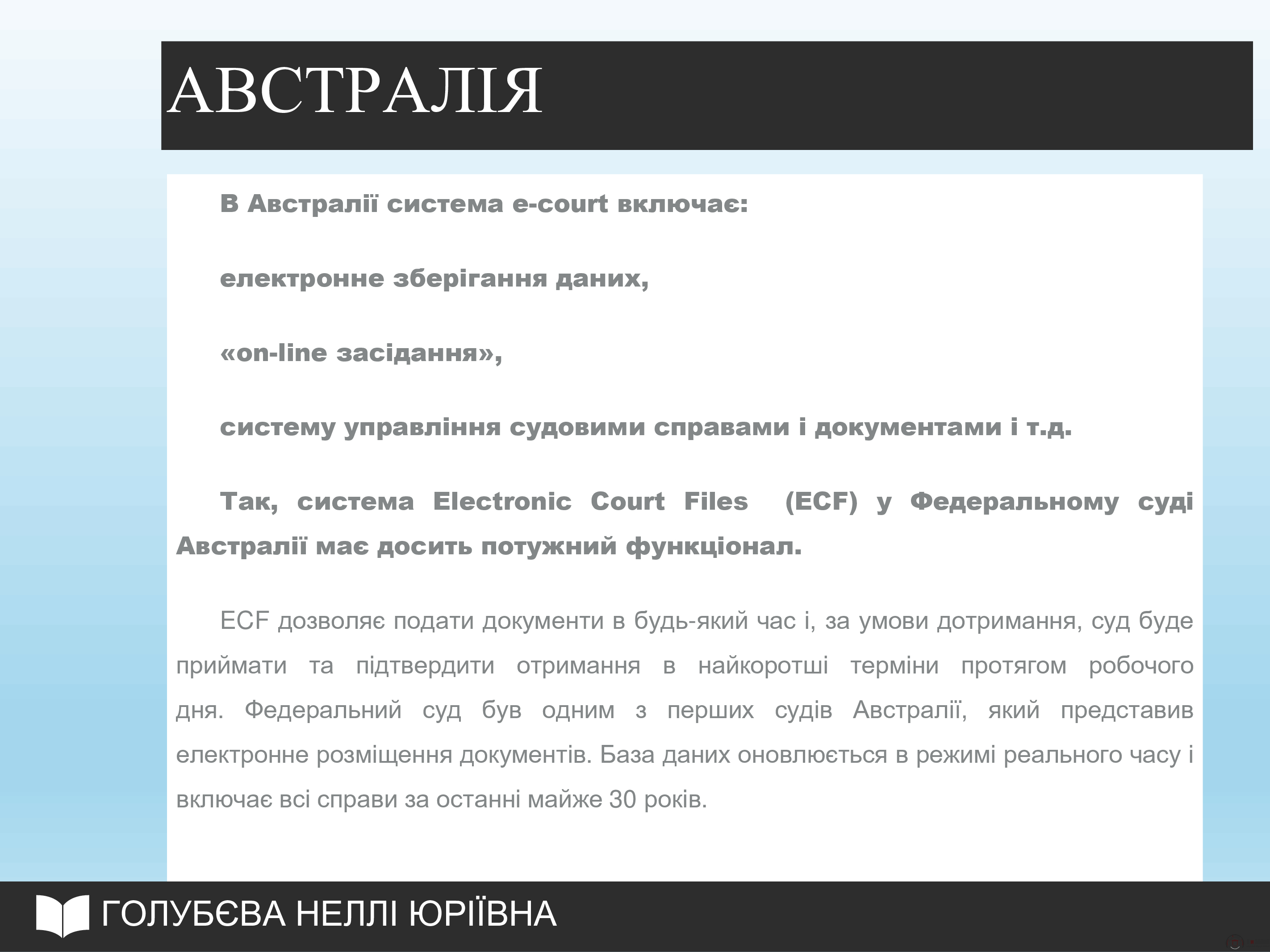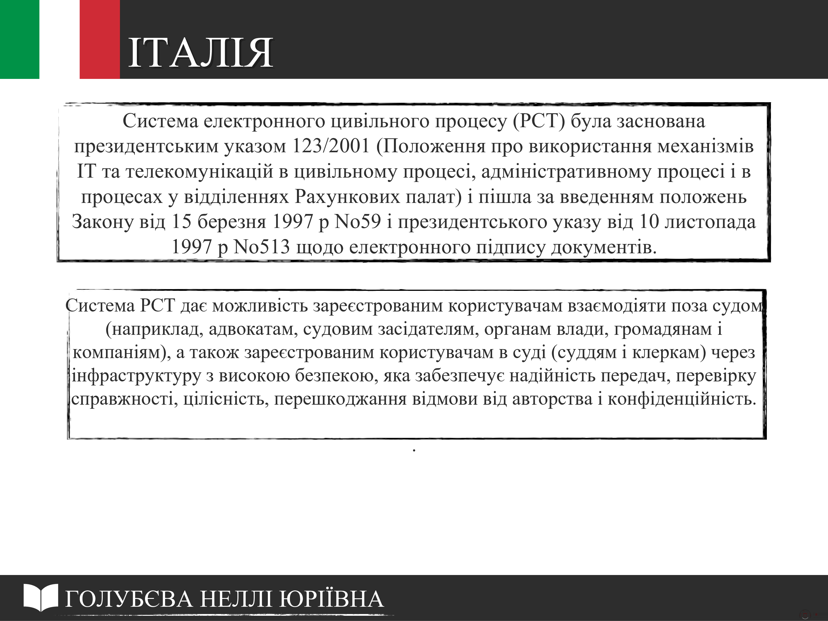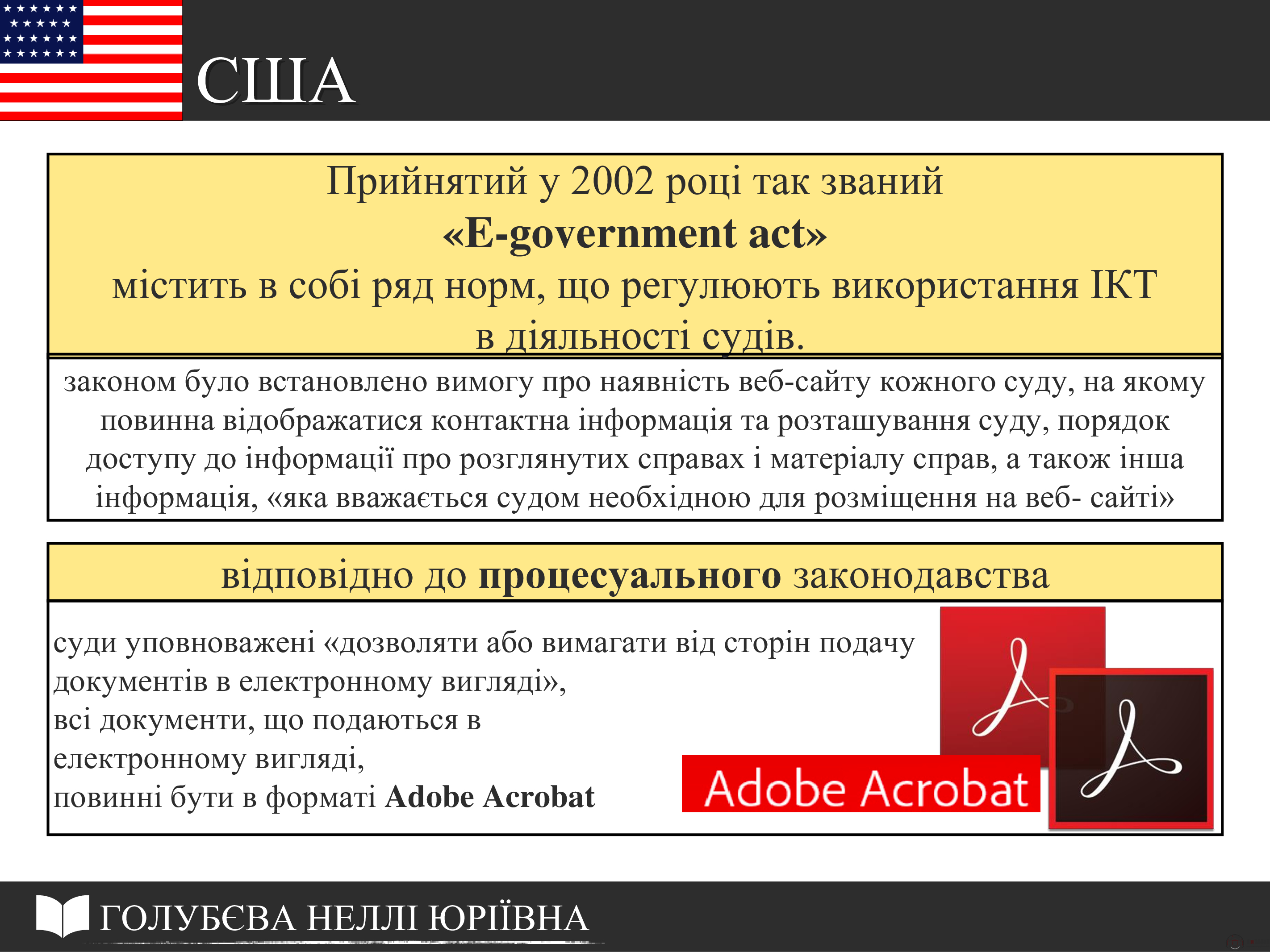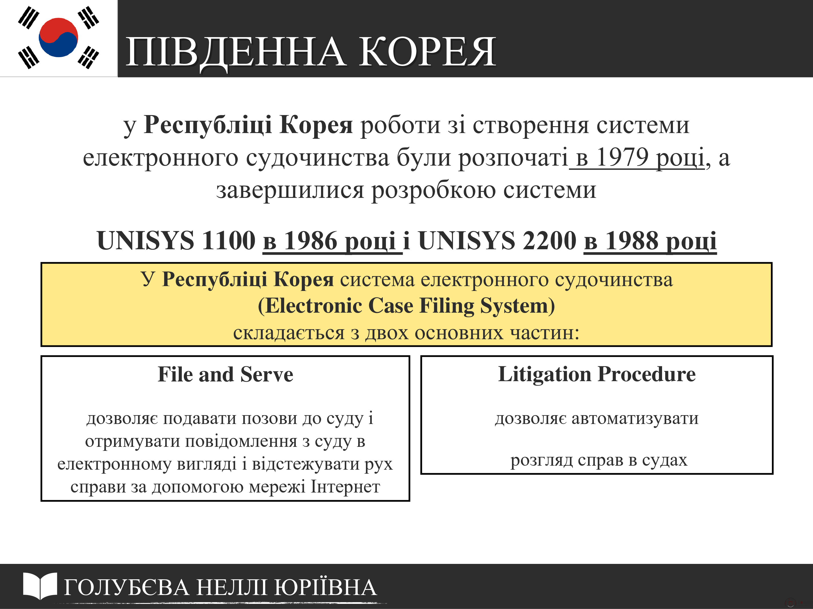 14. Голубєва Н.Ю. Впровадження інформаційно-телекомунікаційних технологій в судову діяльність Німеччини та Франції // Вісник асоціації слідчих суддів України. – 2018. — №1. – С. 37-41.