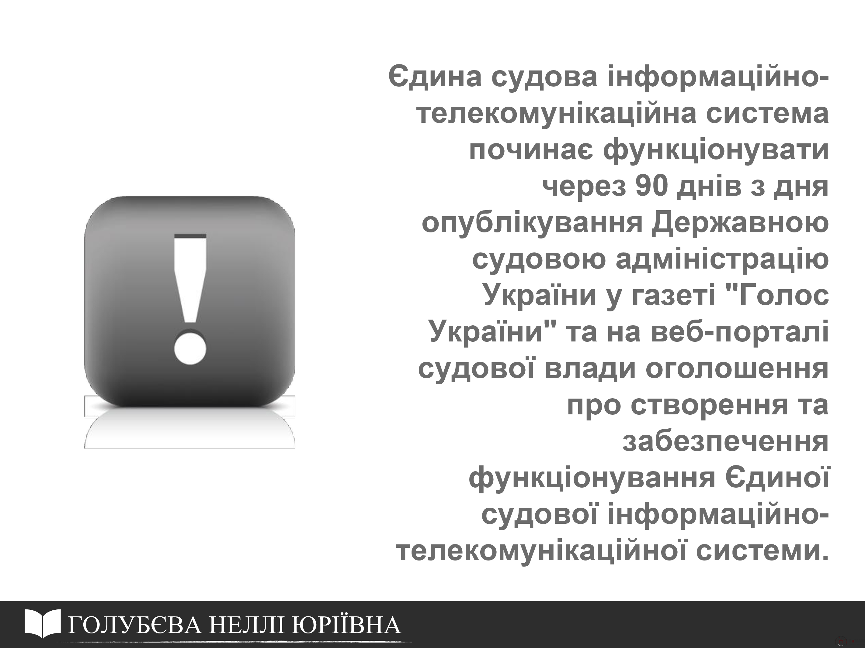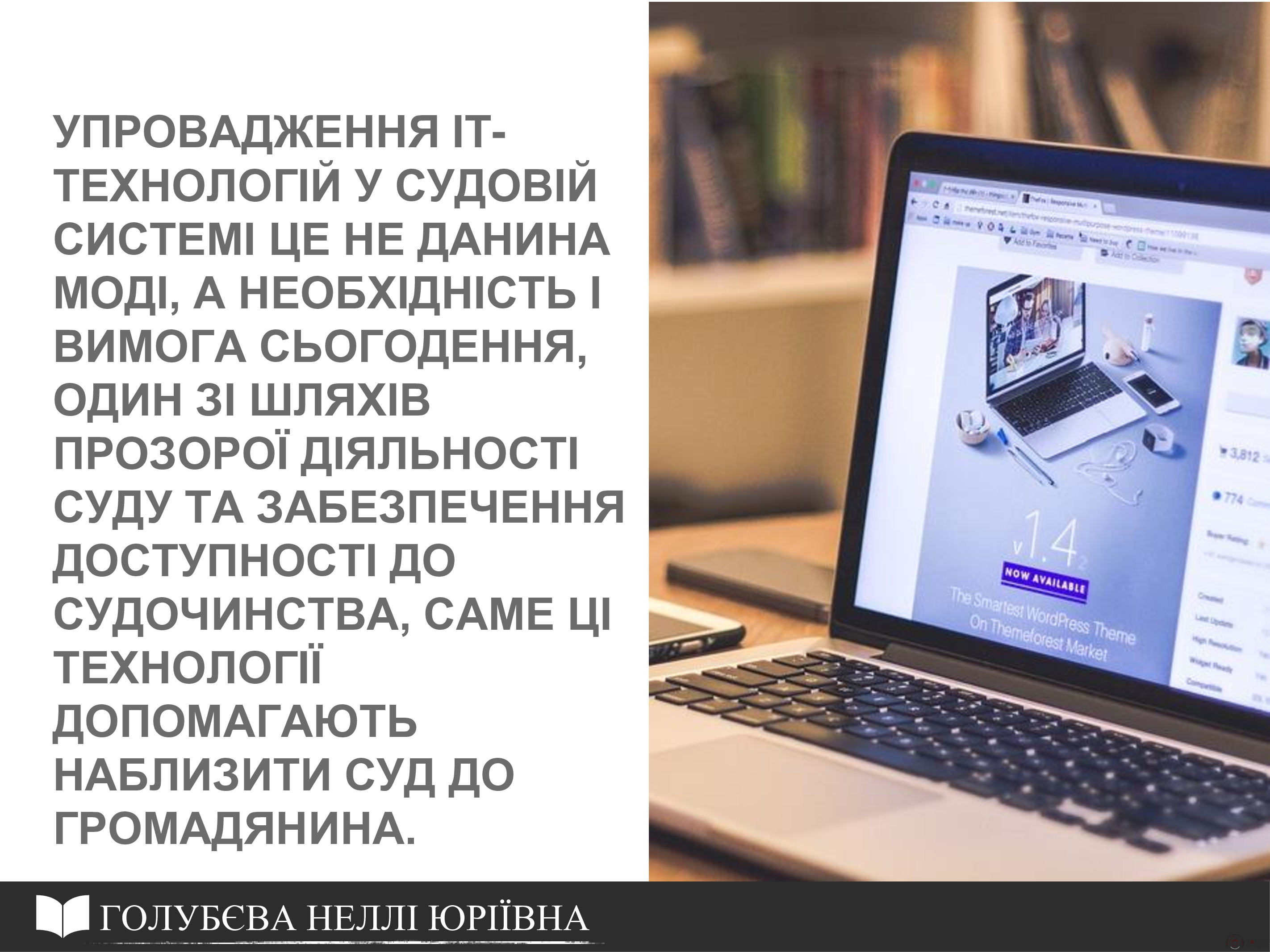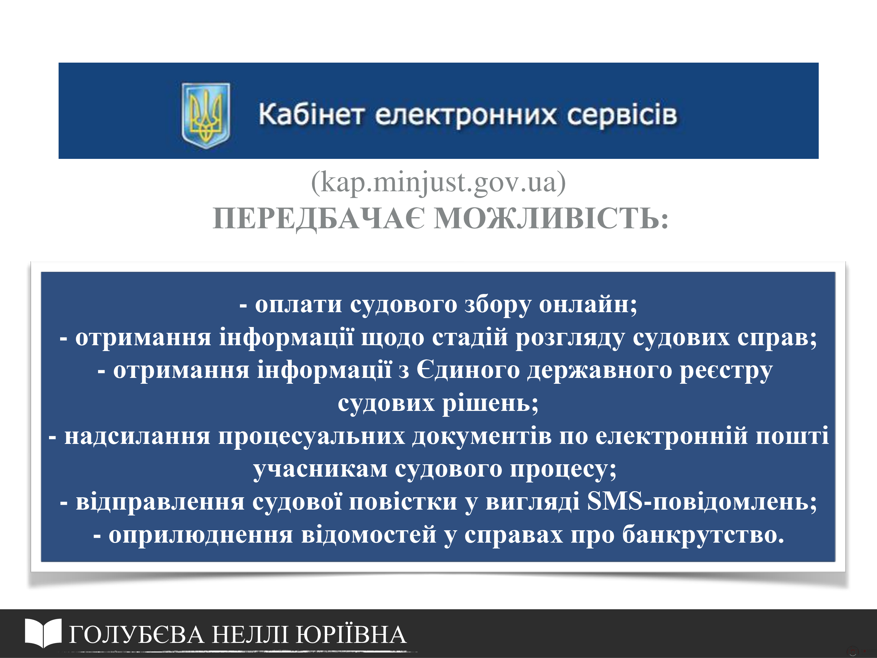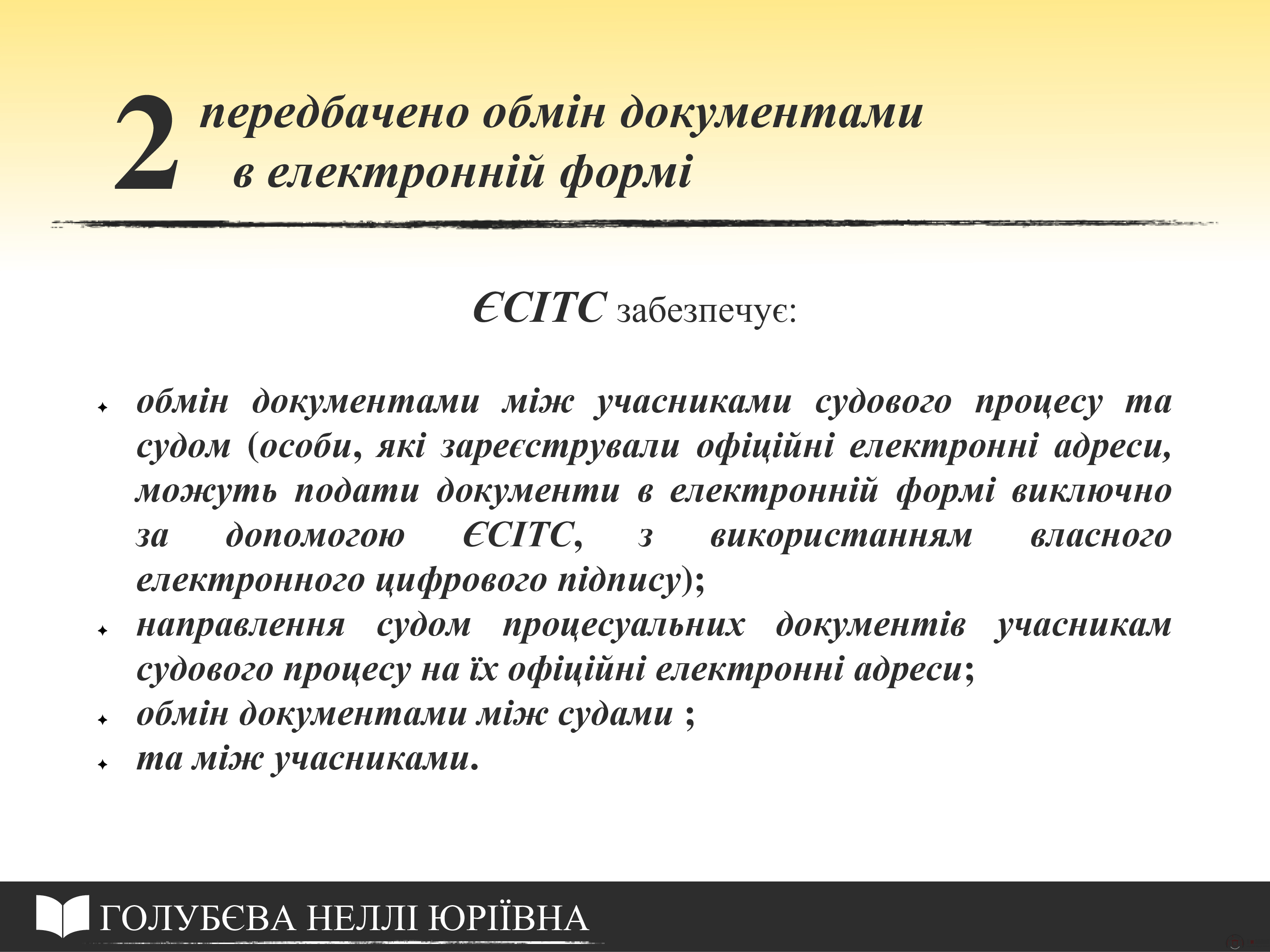 Обеспечит внедрение электронного судопроизводства, в частности электронный документооборот между судами, между судом и участниками судебного процесса Единая судебная информационно-телекоммуникационная система (кабинет пользователя подсистемы ЄСИТС под названием «Электронный суд» начал работу в тестовом режиме с 01.01.2019 г.).
