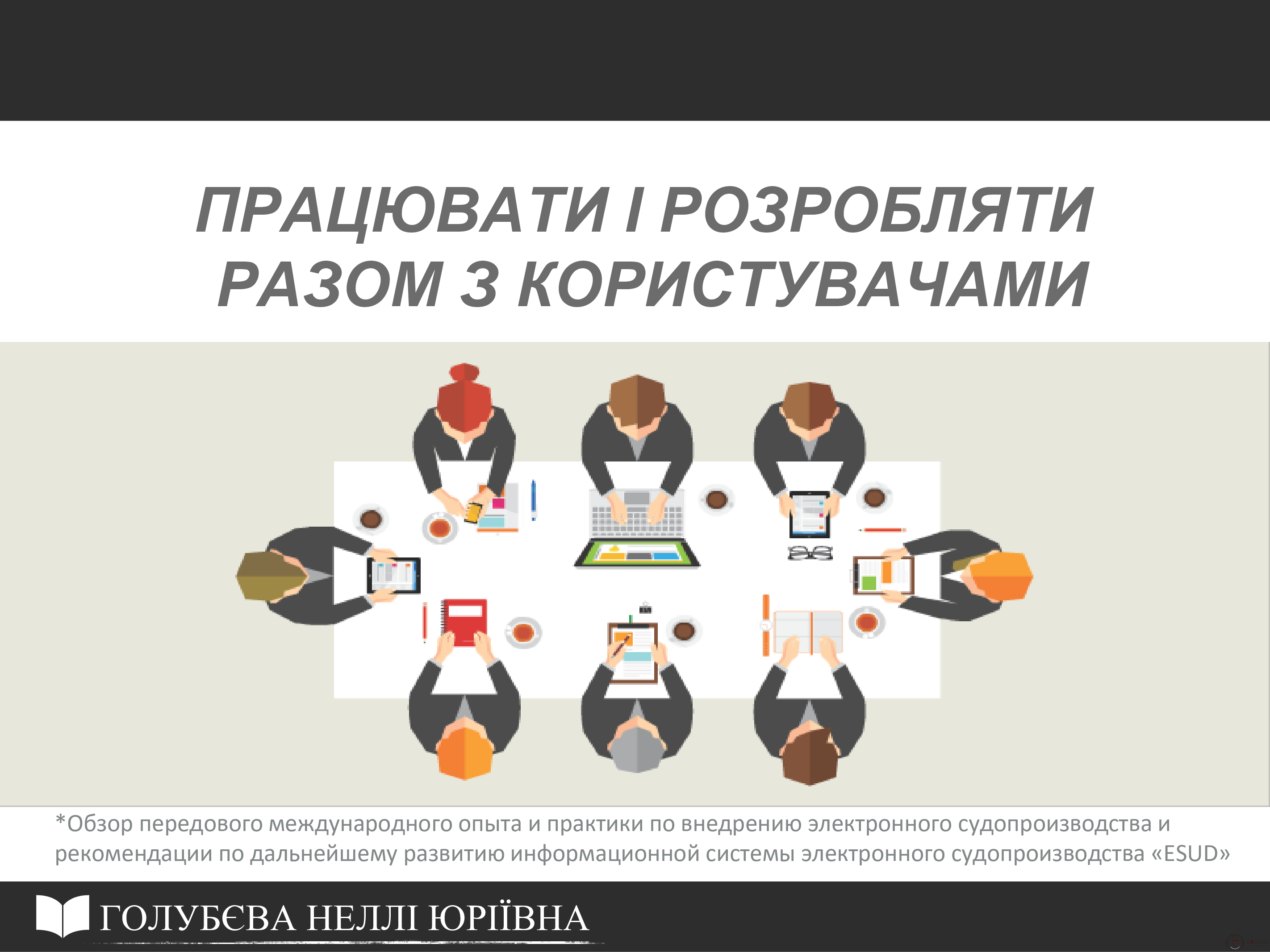 Моя задача, в качестве эксперта, виделась мне в необходимости изложить для судей, которые принимали участия в тренингах, понятие «электронного суда», основных его опций, состояние внедрения в разных странах и перспективное тогда украинское законодательство (проекты изменений к процессуальным кодексам еще не были приняты, только обсуждались, а сама концепция внедрения «электронного суда» коренным образом изменилась со дня начала ее обсуждения).