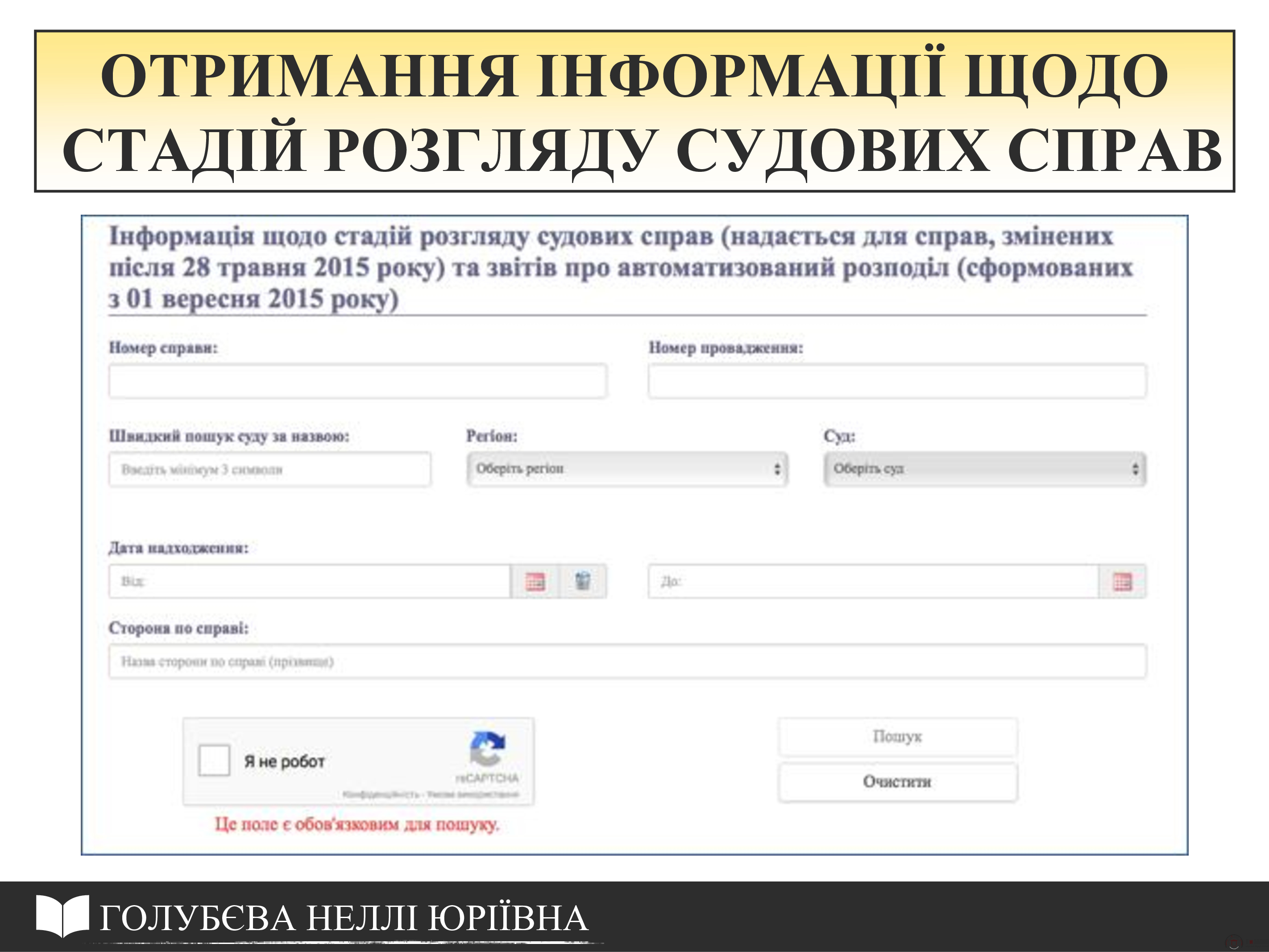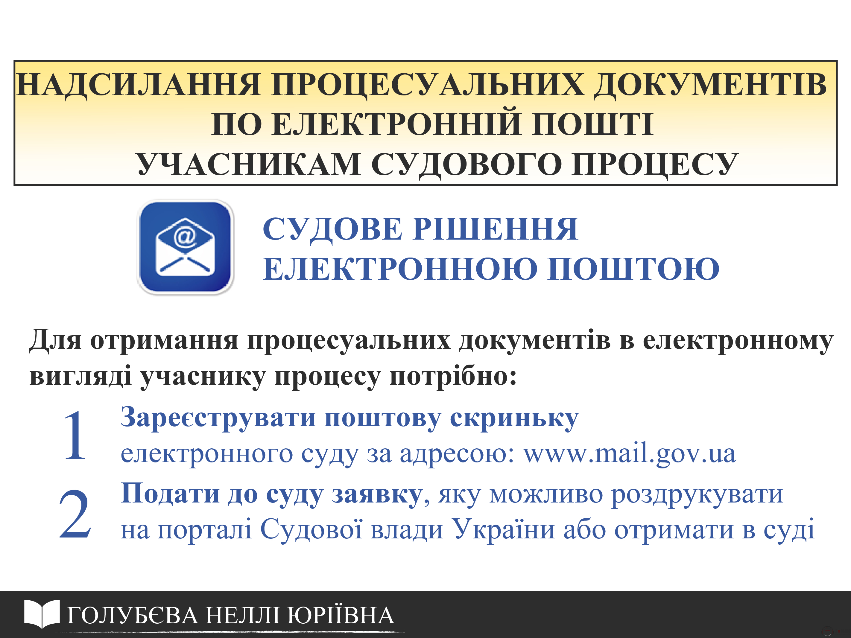5. Голубева Н.Ю. Процессуальные основы внедрения электронного суда (обзор перспективного законодательства) // Вісник Асоціації слідчих суддів України. – 2017. — № 1(2). – С. 42-48.