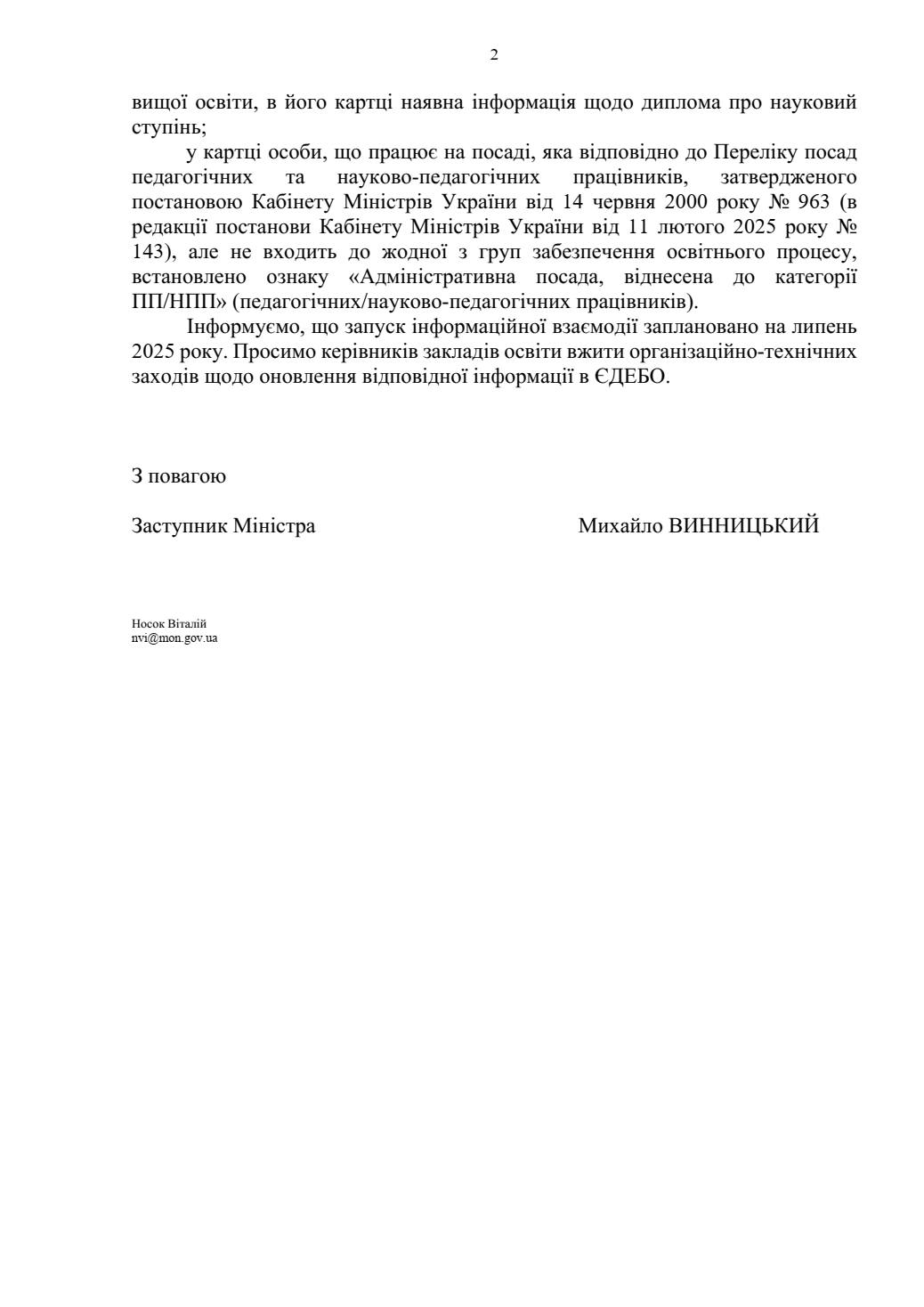 До закладів вищої освіти надійшов лист, з якого вбачається, що Міністерство освіти і науки України спільно з Міністерством оборони України працюють над налагодженням інформаційного обміну між Єдиною державною електронною базою з питань освіти (ЄДЕБО) та Єдиним державним реєстром призовників, військовозобов’язаних та резервістів для реалізації можливості автоматичного надання відстрочки від призову на військову службу під час мобілізації на особливий період для військовозобов’язаних, що мають право на відстрочку з підстави, визначеної пунктом 2 частини третьої статті 23 Закону України “Про мобілізаційну підготовку та мобілізацію”, а саме: