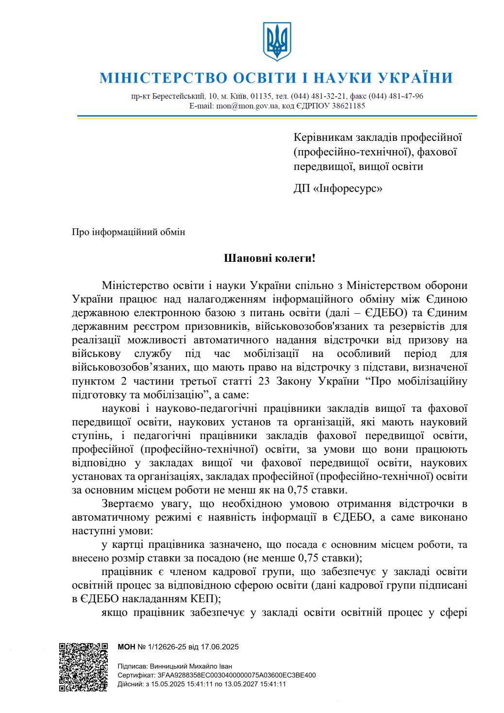 До закладів вищої освіти надійшов лист, з якого вбачається, що Міністерство освіти і науки України спільно з Міністерством оборони України працюють над налагодженням інформаційного обміну між Єдиною державною електронною базою з питань освіти (ЄДЕБО) та Єдиним державним реєстром призовників, військовозобов’язаних та резервістів для реалізації можливості автоматичного надання відстрочки від призову на військову службу під час мобілізації на особливий період для військовозобов’язаних, що мають право на відстрочку з підстави, визначеної пунктом 2 частини третьої статті 23 Закону України “Про мобілізаційну підготовку та мобілізацію”, а саме: