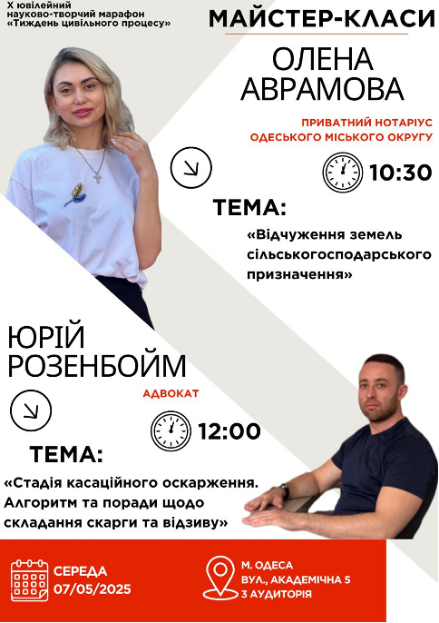 Кафедра цивільного, нотаріального та виконавчого процесу Національного університету «Одеська юридична академія» висловлює щиру подяку всім учасникам Х ювілейного науково-творчого марафону «Тиждень цивільного процесу», керівному складу університету, спікерам, організаторам та відповідальним заходів, журі та партнерам конкурсу за надані призи та підтримку. Наш марафон – це приклад того, як наука може бути живою, відкритою, цікавою і водночас глибокою. Це нагода для студентів розкрити свої таланти, для викладачів – поділитися досвідом, а для всіх нас – побачити, як право і творчість можуть взаємодіяти, надихати і змінювати. До зустрічі вже на наступному ХІ «Тижні цивільного процесу»!