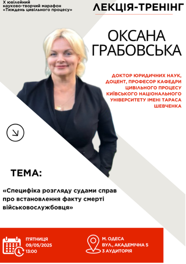 На завершення серії майстер-класів, своє бачення «Специфіки розгляду судами справ про встановлення факту смерті військовослужбовця» представила доктор юридичний наук, доцент, професор кафедри цивільного процесу Київського національного університету імені Тараса Шевченка Оксана Грабовська. Учасники лекції-тренінгу мали можливість дізнатися про складнощі доведення юридичних фактів в умовах війни, особливості процесуального механізму доведення таких фактів, а також про необхідність формування правової позиції для обрання єдиного підходу вирішення такої категорії справ.